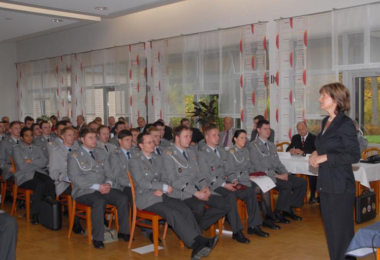 Die ehrenamtliche Geschäftsführerin des Arbeitskreises Bundeswehr-Wirtschaft, Monika Jakobs-Woltering, ansonsten Arbeitsvermittlerin beim Arbeitgeberservice der Nürnberger Arbeitsagentur, moderierte die Vortragsfolge charmant und gekonnt.