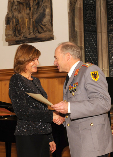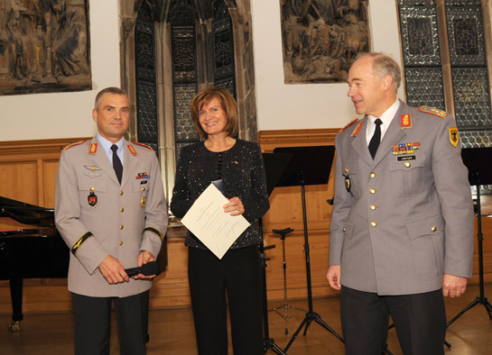 Dass diese Leistungen auch von der Bundeswehrführung gewürdigt werden, zeigte sich in einer besonderen Ehrung. Monika Jakobs-Woltering wurde für ihre Verdienste von den Generälen von Butler und Wolski mit dem vom Bundesminister der Verteidigung verliehenen "Ehrenkreuz der Bundeswehr in Silber" ausgezeichnet.