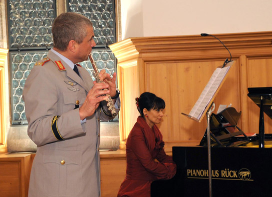 Dass auch Soldaten außerhalb eines Musikkorps talentierte Musiker sein können, bewies Brigadegeneral Reinhard Wolski, der oberste Heeresflieger der Bundeswehr. Einfühlsam begleitet von Pianistin Goldstein-Manz steuerte er zwei romantische Musikstücke mit der Querflöte bei. Wie schon im Vorjahr reihte er sich nahtlos in die Phalanx der professionellen Protagonisten auf beachtlichem Niveau ein.